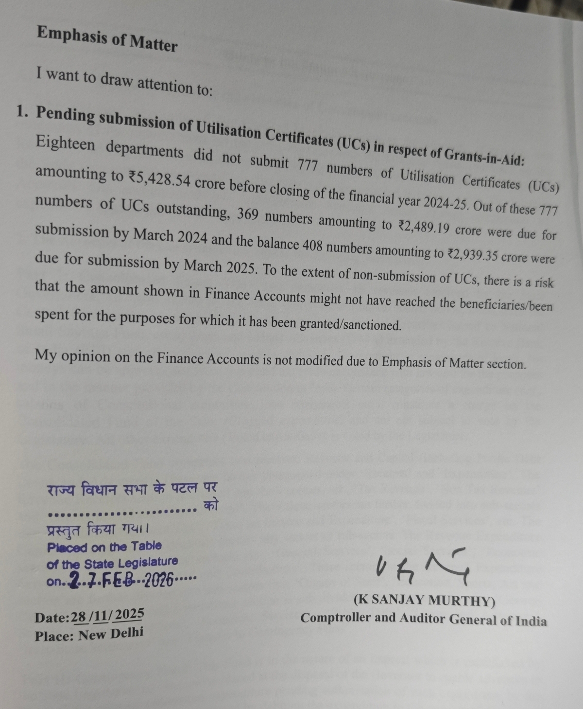 According to the report of CAG on finance accounts(Volume1) 2024-25, the pending submission of UCs for Rs 5428.54 crore is in respect of grants-in-aid