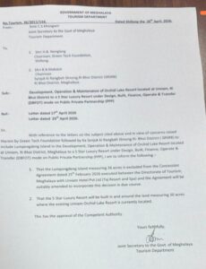 With reference to the letters on the subject cited above and in view of concerns raised therein by Green Tech Foundation followed by Ka Synjuk ki Rangbah Shnong Ri- Bhoi District (SRSRB) to include Lumpongdeng Island in the Development, Operation & Maintenance of Orchid Lake Resort located at Umiam, Ri Bhoi District, Meghalaya to a 5 Star Luxury Resort under Design, Built, Finance, Operate & Transfer (DBFOT) mode on Public Private Partnership (PPP), I am to inform the following:-