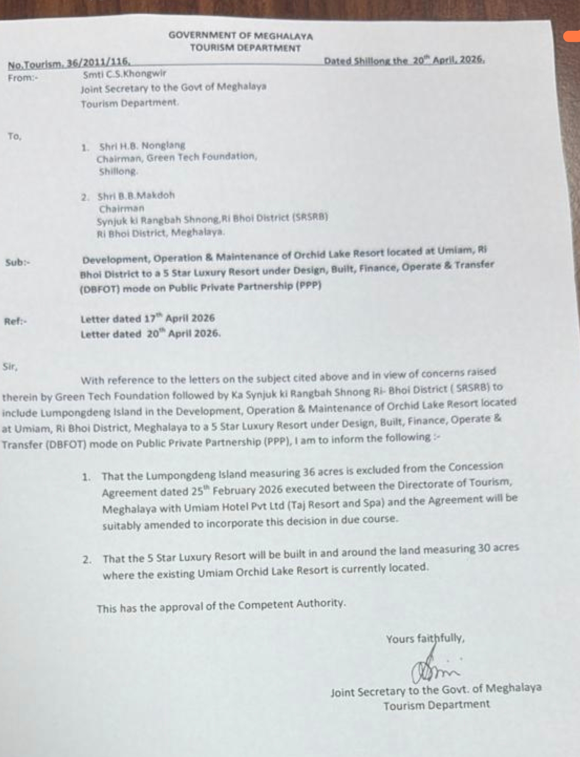 1. That the Lumpongdeng Island measuring 36 acres is excluded from the Concession Agreement dated 25th February 2026 executed between the Directorate of Tourism, Meghalaya with Umiam Hotel Pvt Ltd (Taj Resort and Spa) and the Agreement will be suitably amended to incorporate this decision in due course.