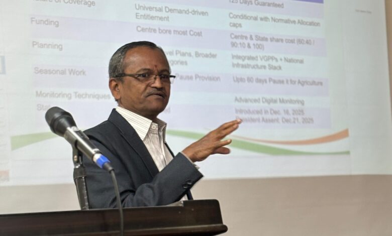 Highlighting the limitations of incremental reforms under MGNREGA, Murugesan explained that the Viksit Bharat – Guarantee for Rozgar and Ajeevika Mission (Gramin) Act, 2025 represents a decisive policy shift as the new Act addresses structural weaknesses while strengthening employment generation, transparency, planning and accountability. The transition from a central sector scheme to a centrally sponsored framework recognises the local nature of rural employment and asset creation, with Gram Panchayat-led planning, shared responsibility between the Centre and States, and a normative allocation framework to improve efficiency and prevent misuse.