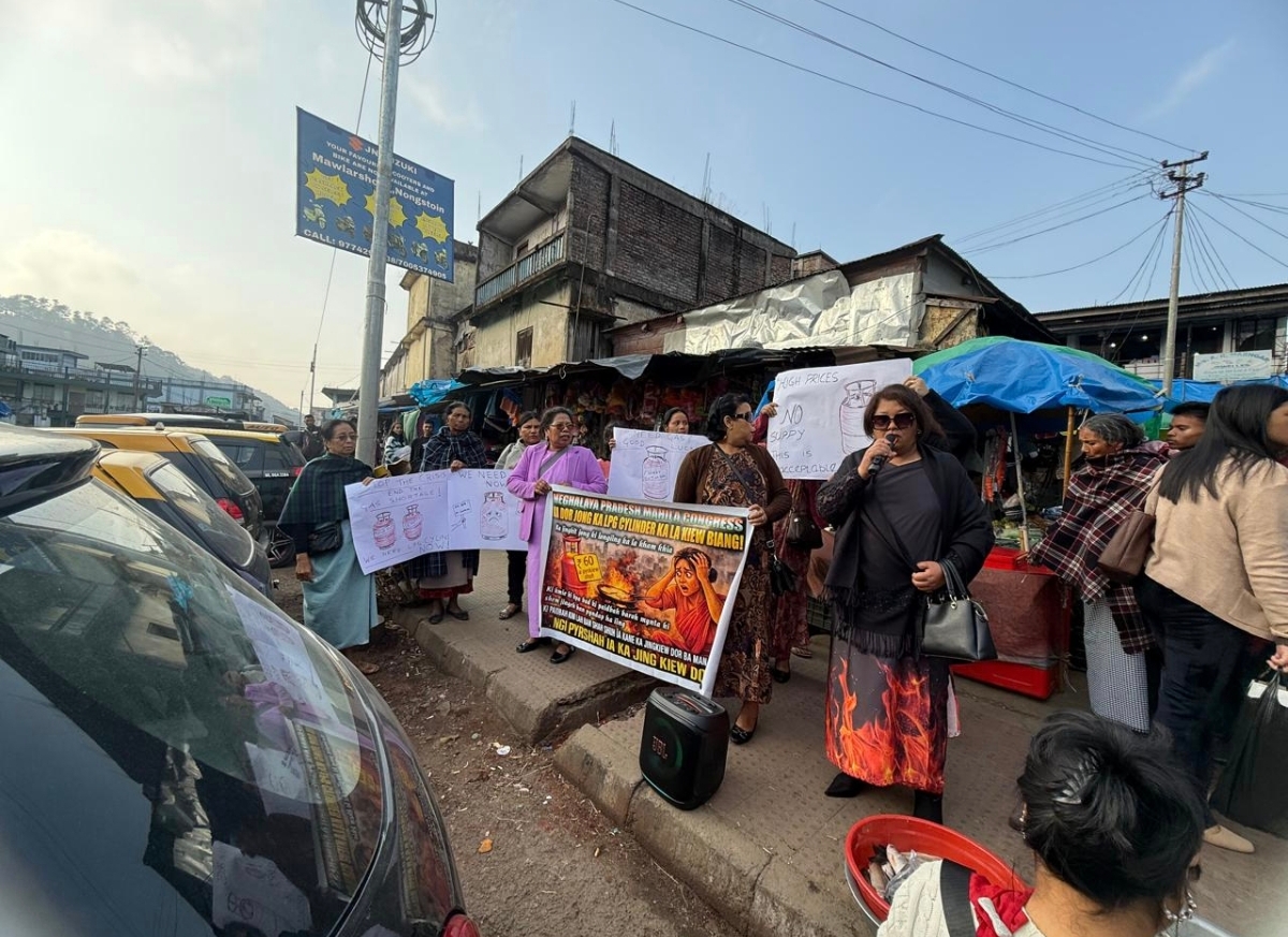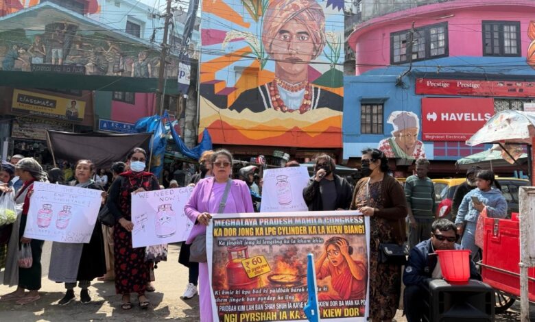 Shillong, March 17: The Meghalaya Pradesh Mahila Congress, under the leadership of Joplyn Scott Shylla, held a protest at Motphran and Nongstoin bazaar to condemn the recent price hike and the shortage of LPG gas cylinders in the state, on March 16.