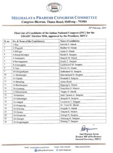 Shillong, Feb 23: The Meghalaya Pradesh Congress Committee (MPCC) on Monday released the first list of candidates to contest the GHADC polls. The list below