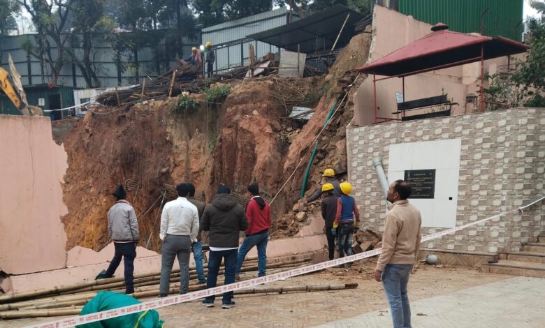 Shillong, March 10: Earth cutting has resulted in the collapse of a large portion of the wall of Matri Mandir, Polo Ground, Shillong, on March 9, posing risks to the devotees and damaging the property of the temple.
