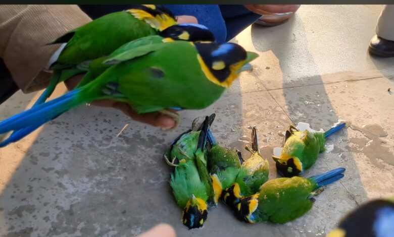 The Mahindra showroom has transparent glass. A flock of around 15 to 20 long-tailed broadbill birds came from the Umiam lakeside and hit the glass of the showroom.