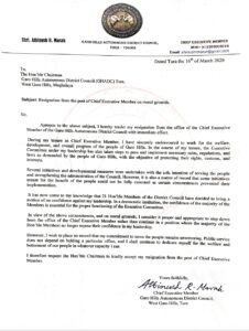 Apropos to the above subject, I hereby tender my resignation from the office of the Chief Executive Member of the Garo Hills Autonomous District Council with immediate effect.