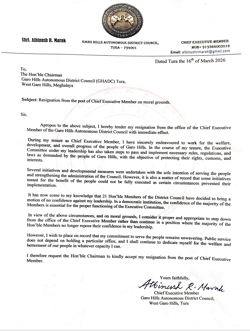 Shillong, March 16: Hours before the no-confidence motion against him, the Chief Executive Member, Albinush Marak, resigned citing moral grounds.