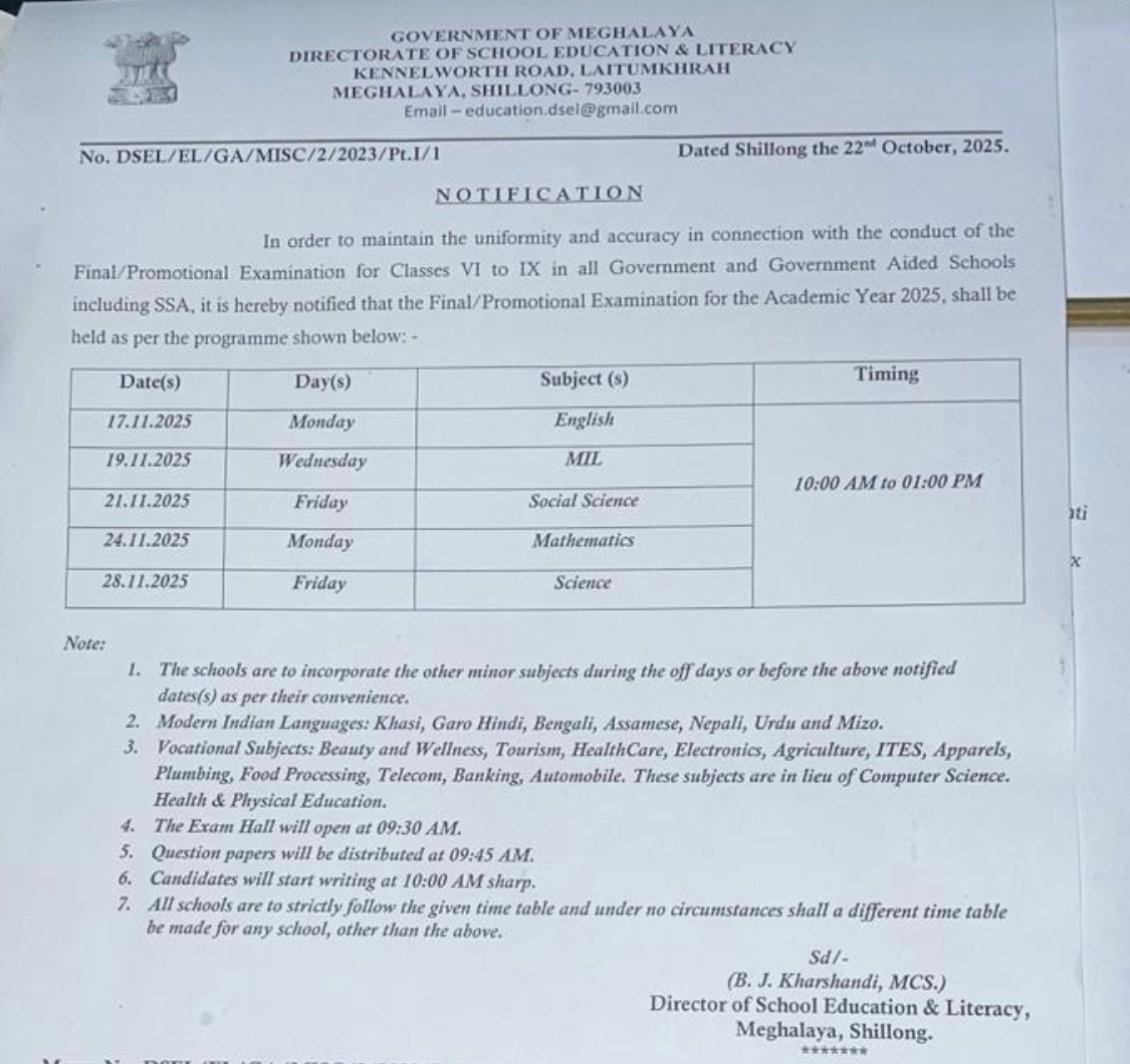 Shillong, Oct 26: Options will be given to schools that can conduct exams for classes VI to IX, though the government is committed to preparing question papers for the schools.