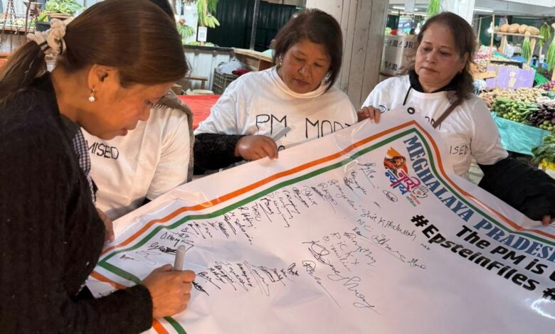 Shillong, March 2: The Meghalaya Pradesh Mahila Congress on Monday held a signature campaign in the city to express concern over the alleged involvement of certain Indian parliamentarians in the Epstein files.