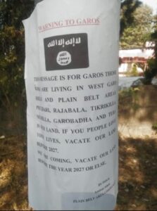 The poster was under the caption ‘Warning to Garos’ attributed to ISIS-K Aminur Islam, Plain Belt Area Commander.