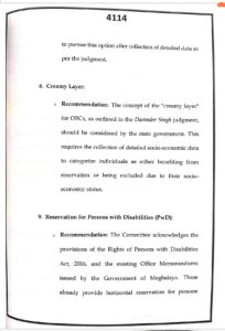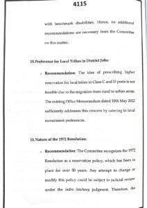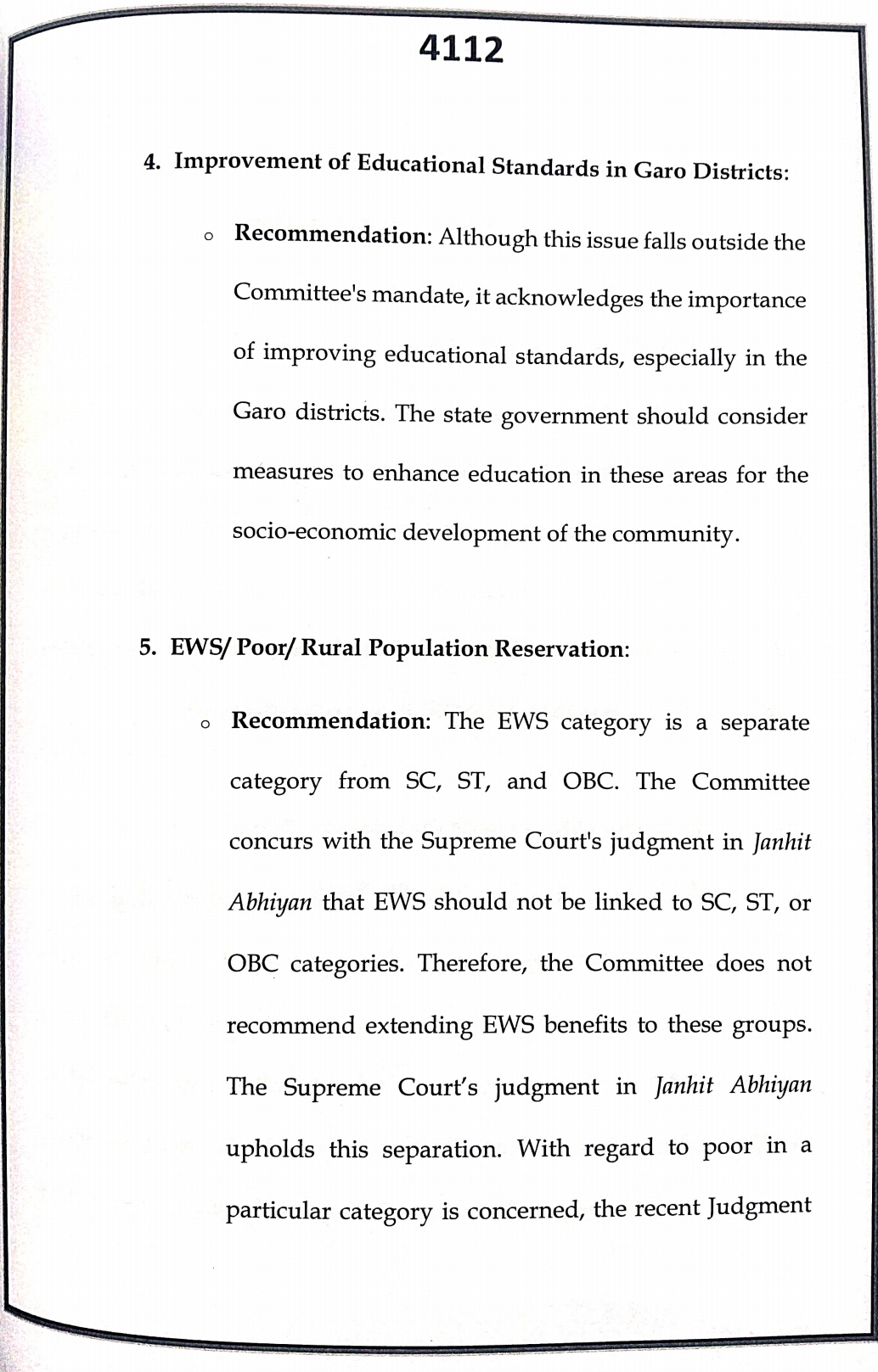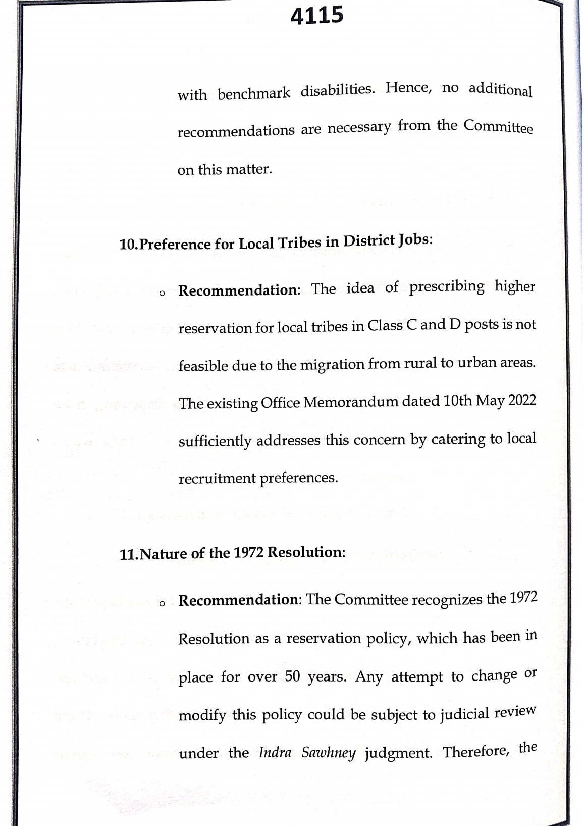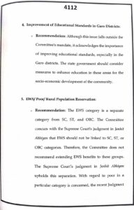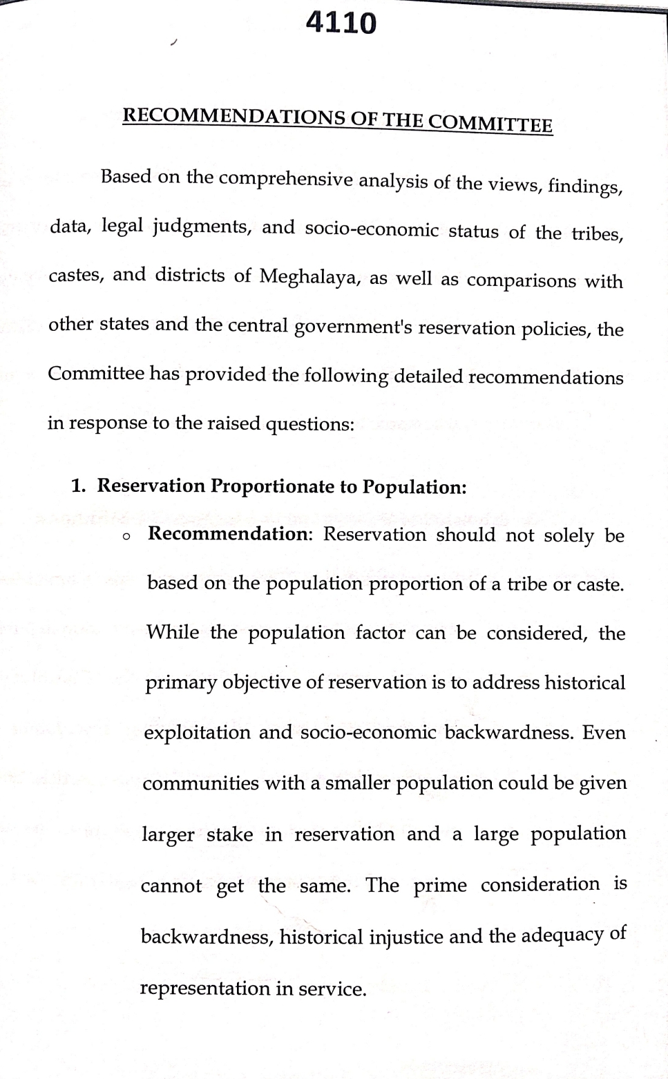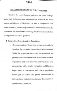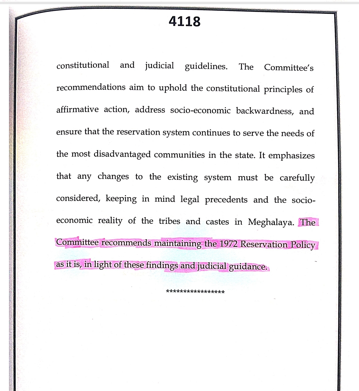 “These recommendations are made in light of the legal framework, public opinion, and judicial precedents to ensure that the reservation policy continues to serve its purpose of uplifting backward communities while staying within the bounds of constitutional and judicial guidelines. The Committee’s recommendations aim to uphold the constitutional principles of affirmative action, address socio-economic backwardness, and ensure that the reservation system continues to serve the needs of the most disadvantaged communities in the state. It emphasizes that any changes to the existing system must be carefully considered, keeping in mind legal precedents and the socio-economic reality of the tribes and castes in Meghalaya. The Committee recommends maintaining the 1972 Reservation Policy as it is, in light of these findings and judicial guidance”, the report said .