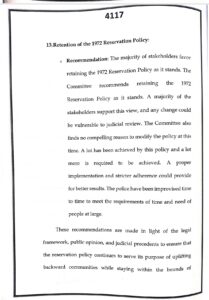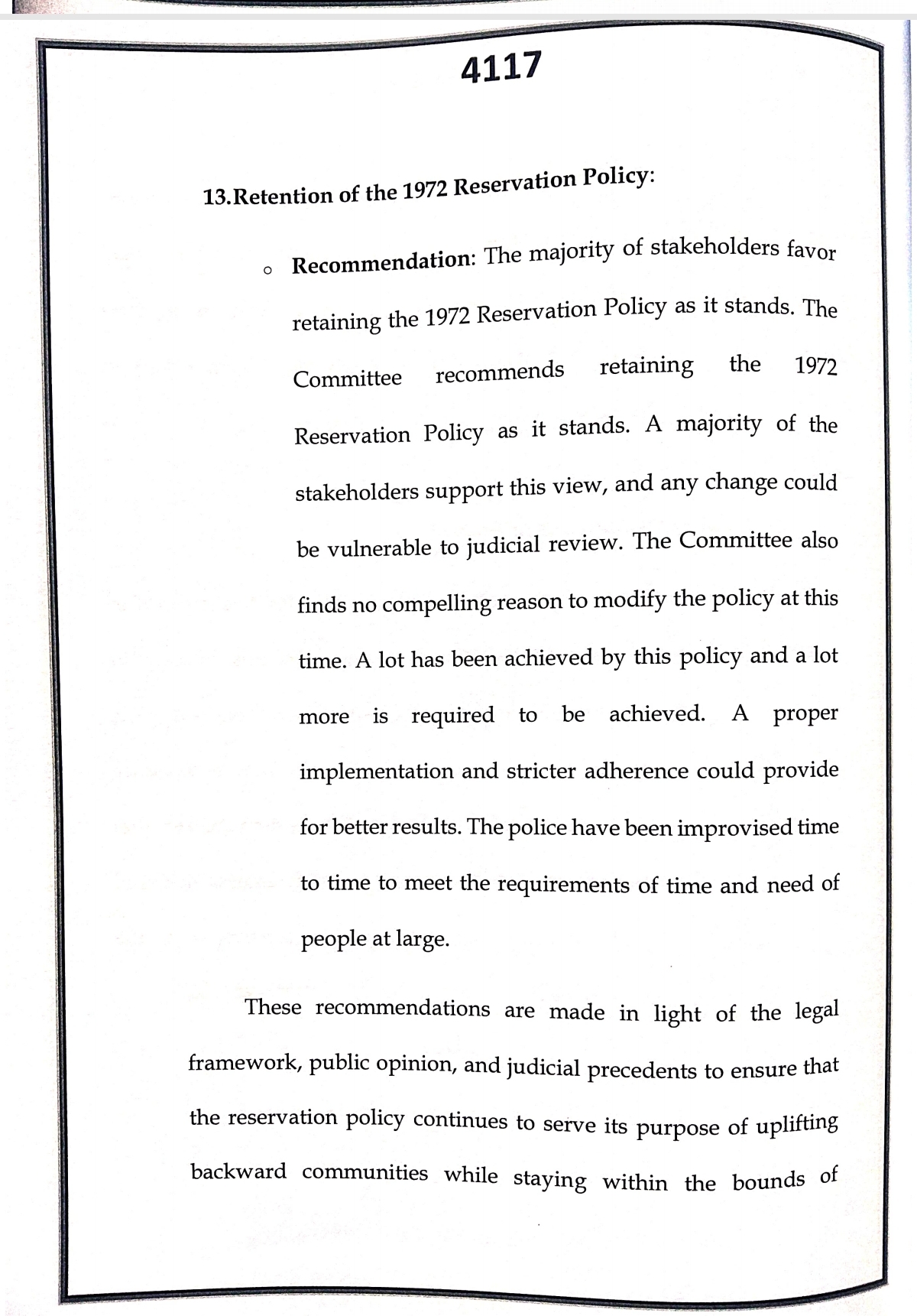 “The Committee recommends maintaining the 1972 Reservation Policy as it is, in light of these findings and judicial guidance”, said the report tabled in the Assembly.
