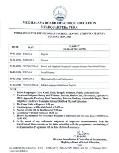 Shillong, Oct 31: Meghalaya Board of School Education (MBoSE) has announced the date of holding the SSLC examination 2026 from January 30.
