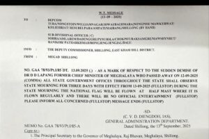 “On account of the demise of our former CM Dr DD Lapang, there will be a State mourning for three days starting Saturday, the 13th September, till Monday, the 15th September”, Chief Secretary DP Wahlang said.