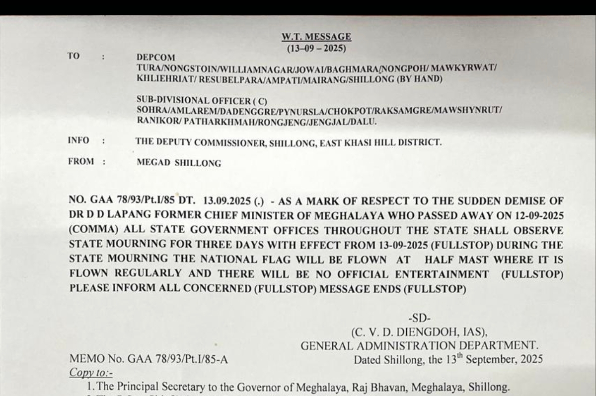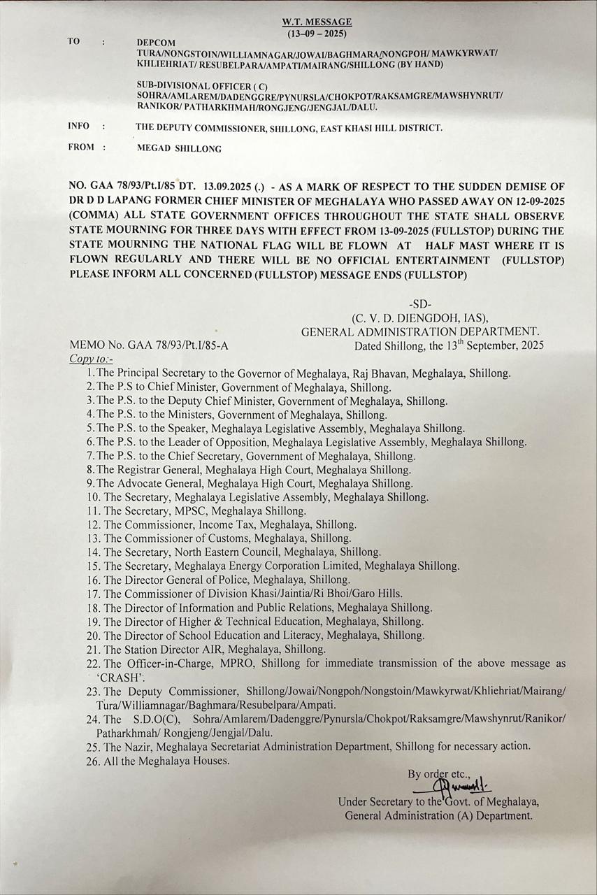 “On account of the demise of our former CM Dr DD Lapang, there will be a State mourning for three days starting Saturday, the 13th September, till Monday, the 15th September”, Chief Secretary DP Wahlang said.