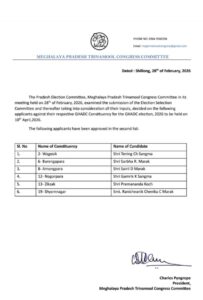 Shillong, March 2: The Trinamool Congress has released the second list of six candidates to contest the GHADC polls.