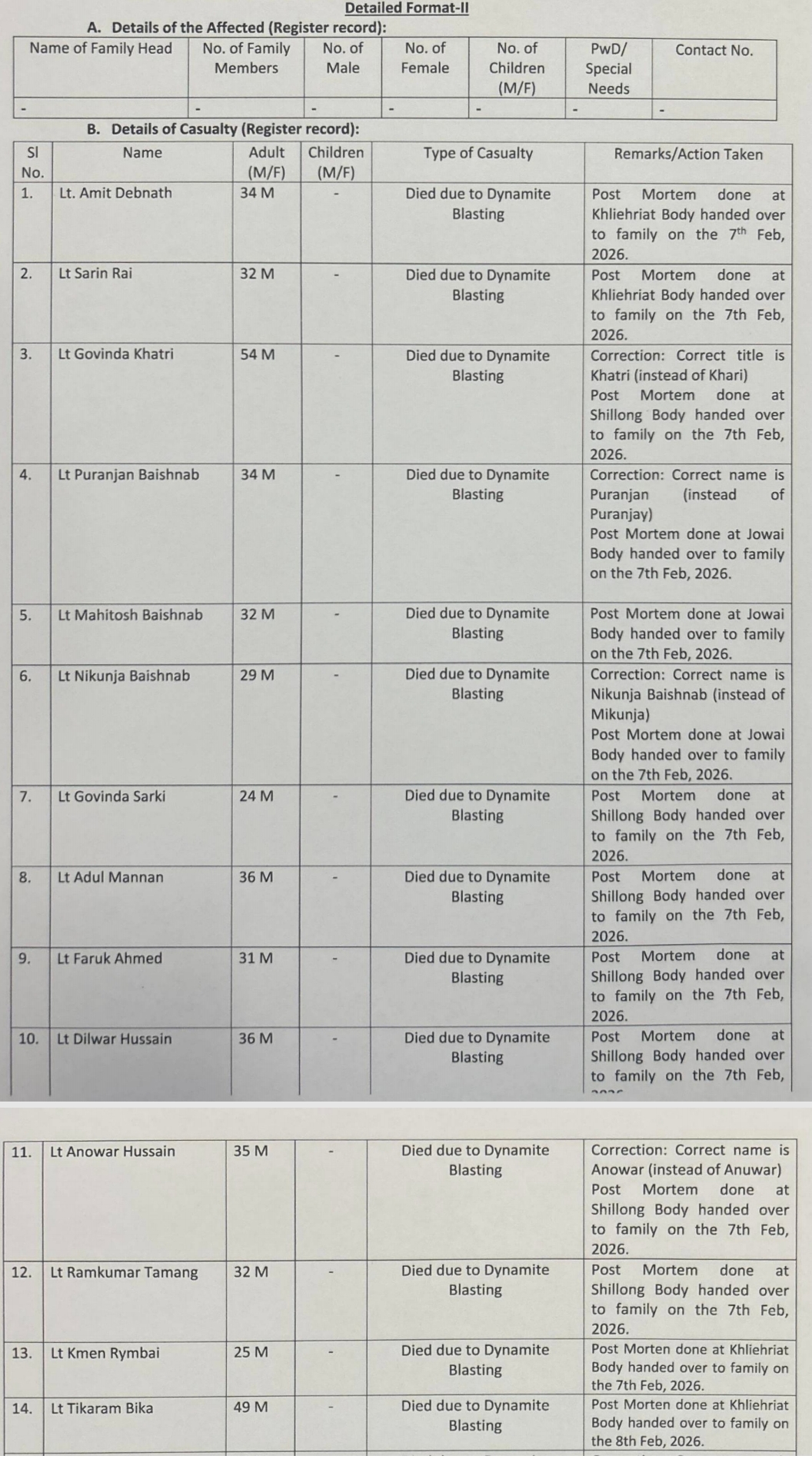 Shillong, Feb 9:Two coal mine workers from East Jaintia Hills are in the list of the deceased persons due to the dynamite blast in the Mynsngat-Thangsko mine on February 5.